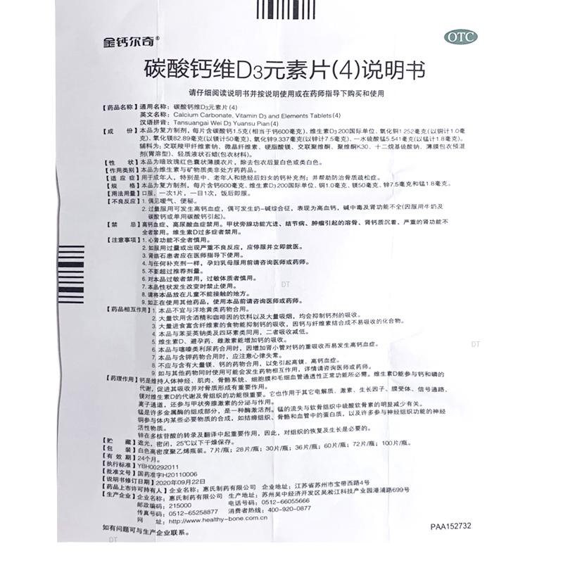 规格:本品为复方制剂,每片含钙600毫克、维生素D3 200国际单位、铜1.0毫克、镁50毫克、锌7.5毫克和锰1.8毫克。