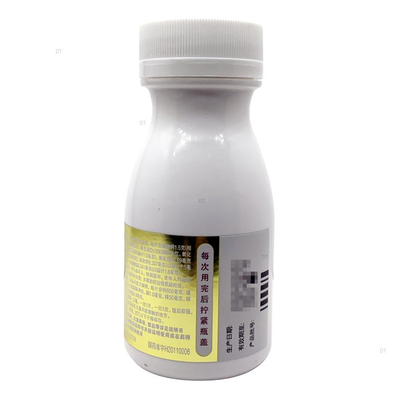 成份:本品为复方制剂,每片含碳酸钙1.5克(相当于钙600毫克)、维生素D3 200国际单位、氧化铜1.252毫克(以铜计1.0毫克)、氧化镁82.89毫克(以镁计50毫克)、氧化锌9.337毫克(以锌计7.5毫克)、一水硫酸锰5.541毫克(以锰计1.8毫克)。辅料详见说明书