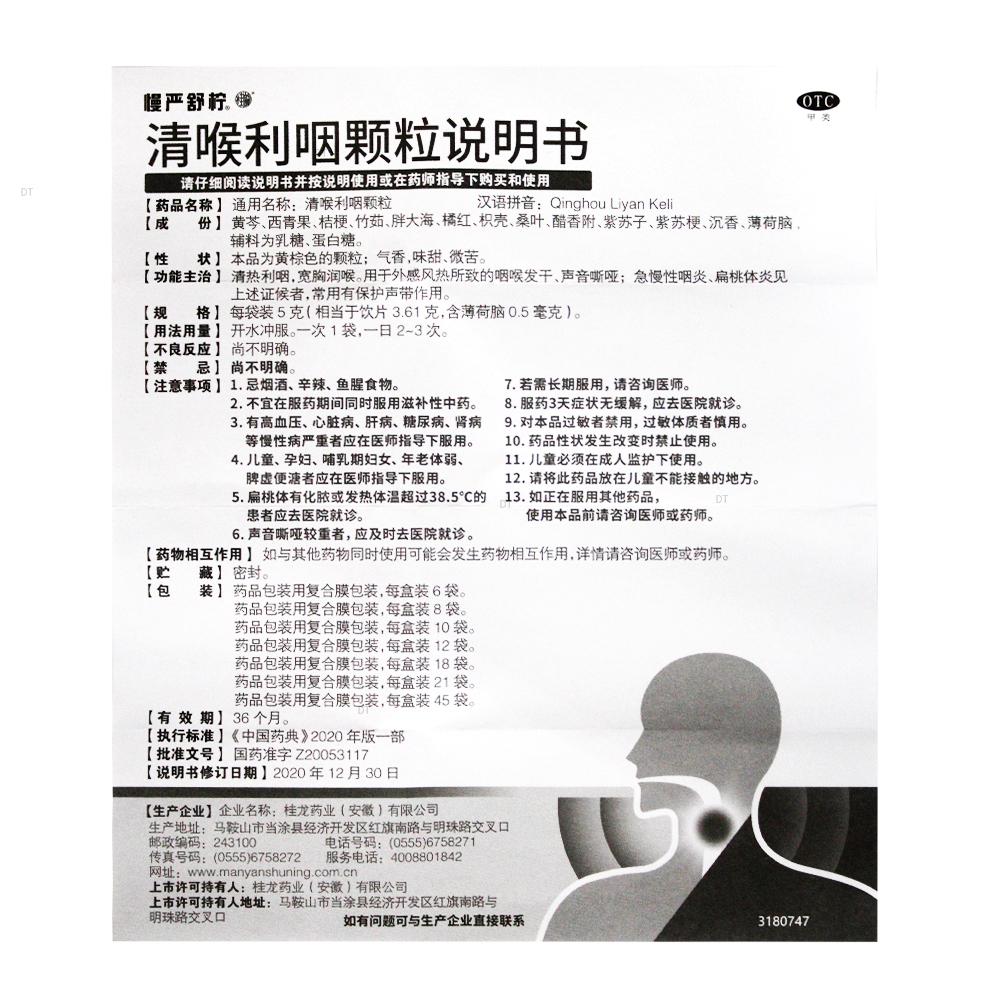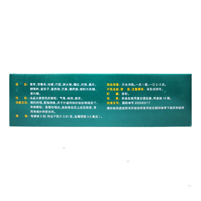 功能主治:清热利咽,宽胸润喉。用于外感风热所致的咽喉发干、声音嘶哑;急慢性咽炎、扁桃体炎见上述证候者,常用有保护声带作用。