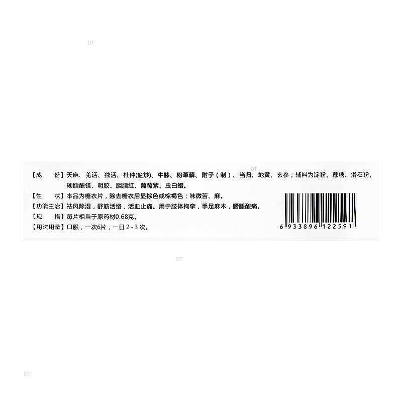 成份:本品成分为天麻、羌活、独活、杜仲(盐炒)、牛膝、粉萆薢、附子(制)、当归、地黄、玄参。