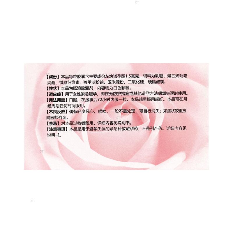 成份:本品每粒胶囊含主要成份左炔诺孕酮1.5毫克,辅料为乳糖、聚乙烯吡咯烷酮、微晶纤维素、羧甲基淀粉钠、淀粉、二氧化硅、硬脂酸镁。