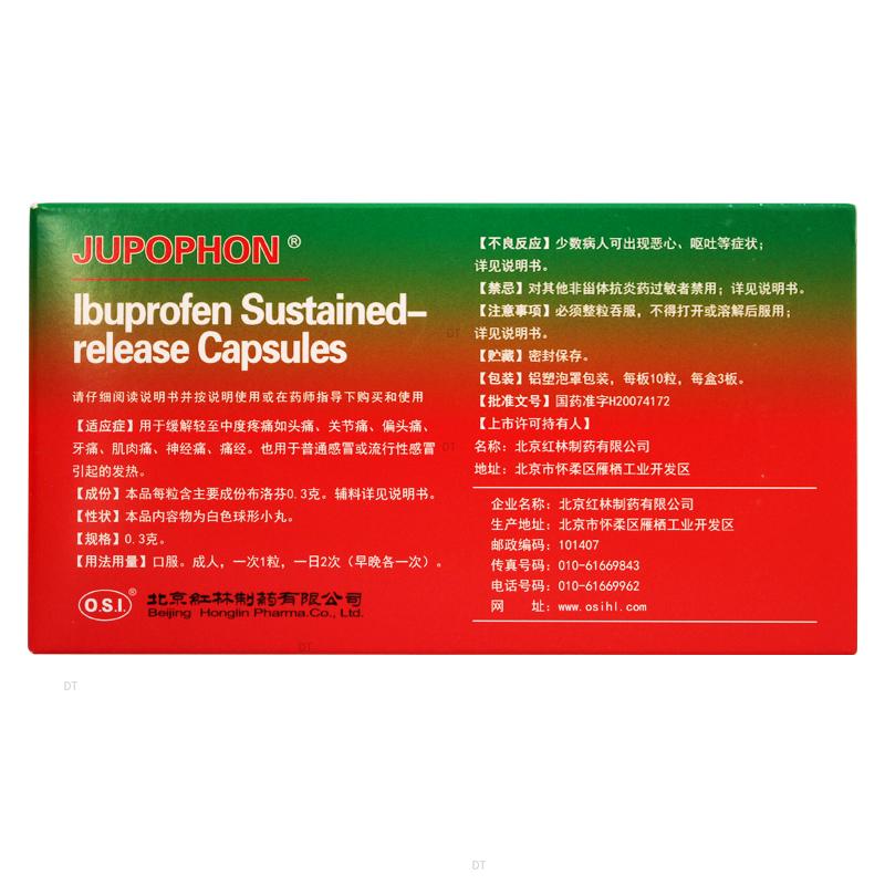 成份:主要组成成分 本品每粒含主要成份布洛芬0.3克。辅料为药用微丸丸芯(蔗糖型)、聚乙二醇6000、十六醇。