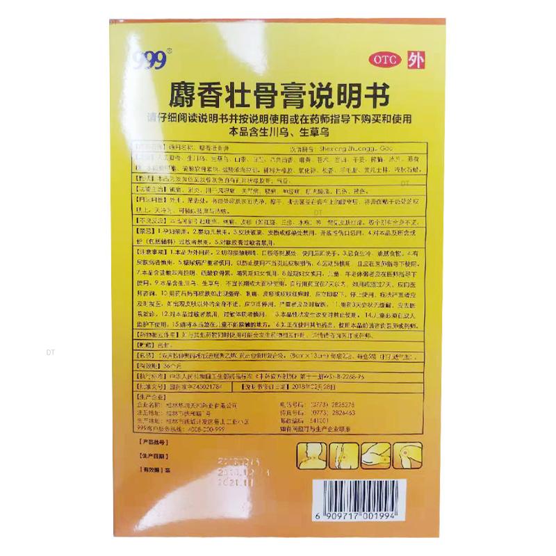 成份:人工麝香、生川乌、生草乌、山柰、白芷、八角茴香、麻黄、苍术、当归、干姜、樟脑、冰片、薄荷脑、水杨酸甲酯、硫酸软骨素、盐酸苯海拉明。辅料为橡胶、氧化锌、松香、羊毛脂、黄凡士林、液状石蜡。