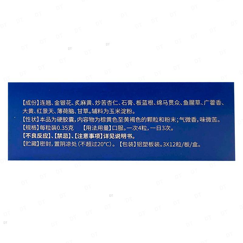成份:连翘、金银花、炙麻黄、炒苦杏仁、石膏、板蓝根、绵马贯众、鱼腥草、广藿香、大黄、红景天、薄荷脑、甘草
