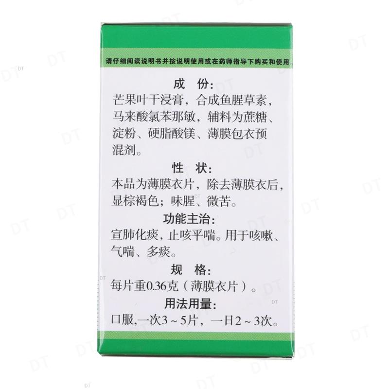 芒果叶干浸膏、鱼腥草素钠、马来酸氯苯那敏。辅料为蔗糖、淀粉。