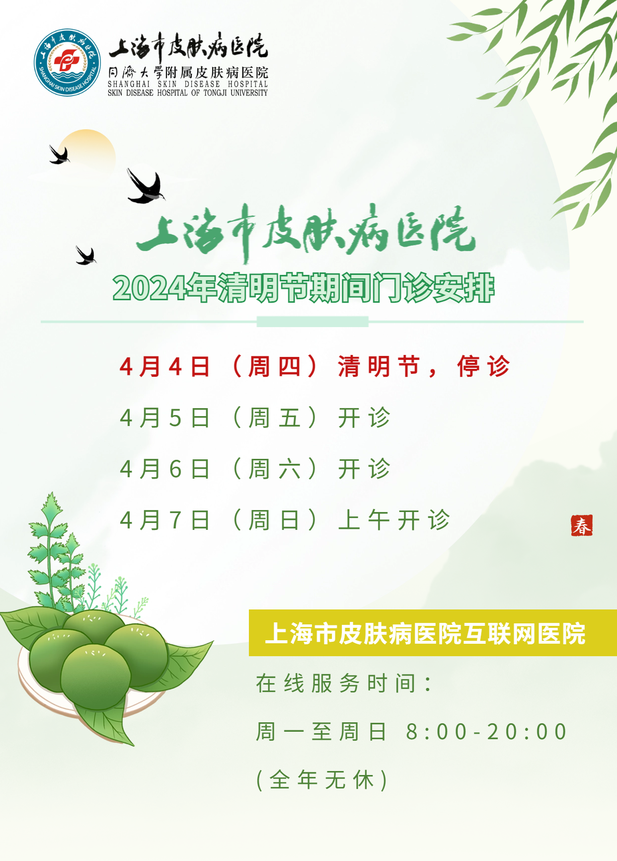 上海市皮肤病医院2024年清明节期间门诊安排
